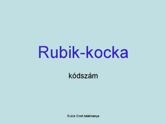 Prezentáció Készítsd el a minta szerinti bemutatót! 1. Állíts be egyszínű, halványkék hátteret a bemutató minden diájára! 2. Állítsd be az 1. dián a címet Arial típusúra, a betűszín legyen sötétkék, a betűméret 72 pont! 3. Az 1. dia alcíme a kódszámod legyen! 4. A 2. dia címe legyen Comic Sans Ms, narancsszínű, 44 pontos! 5. A 2. dia jobb felére illeszd be a „kocka.jpg” képet! 6. A „kocka.jpg” kép körüli vonal legyen 3 pont, dupla vékony, bordó színű! 7. A „kocka.jpg”képen „Forgás” típusú animáció legyen! 8. A 2. dián a felsorolás bekezdései vetítéskor egyenként jelenjenek meg „leereszkedik” típusú animációval! 9. Cseréld le a 2. dián a felsorolásjelző szimbólumokat narancssárga színű „” jelekre! 10. Írd be az élőlábba a „Rubik Ernő találmánya” feliratot úgy, hogy mindegyik dián megjelenjen! 11. Állíts be mindegyik diára 3 másodpercenkénti automatikus továbbítást és „törlés lefele” típusú áttűnést! 12. A 3. diára készítsd el az összekevert kocka elölnézetét! A négyzeteket színezd ki hat különböző színnel (piros, sárga, kék, zöld, fekete, fehér), majd csoportosítsd az ábrát! 13. Az állományt mentsd el a kész mappába! Az állomány neve a kódszámod legyen, ppt kiterjesztéssel! ![]()